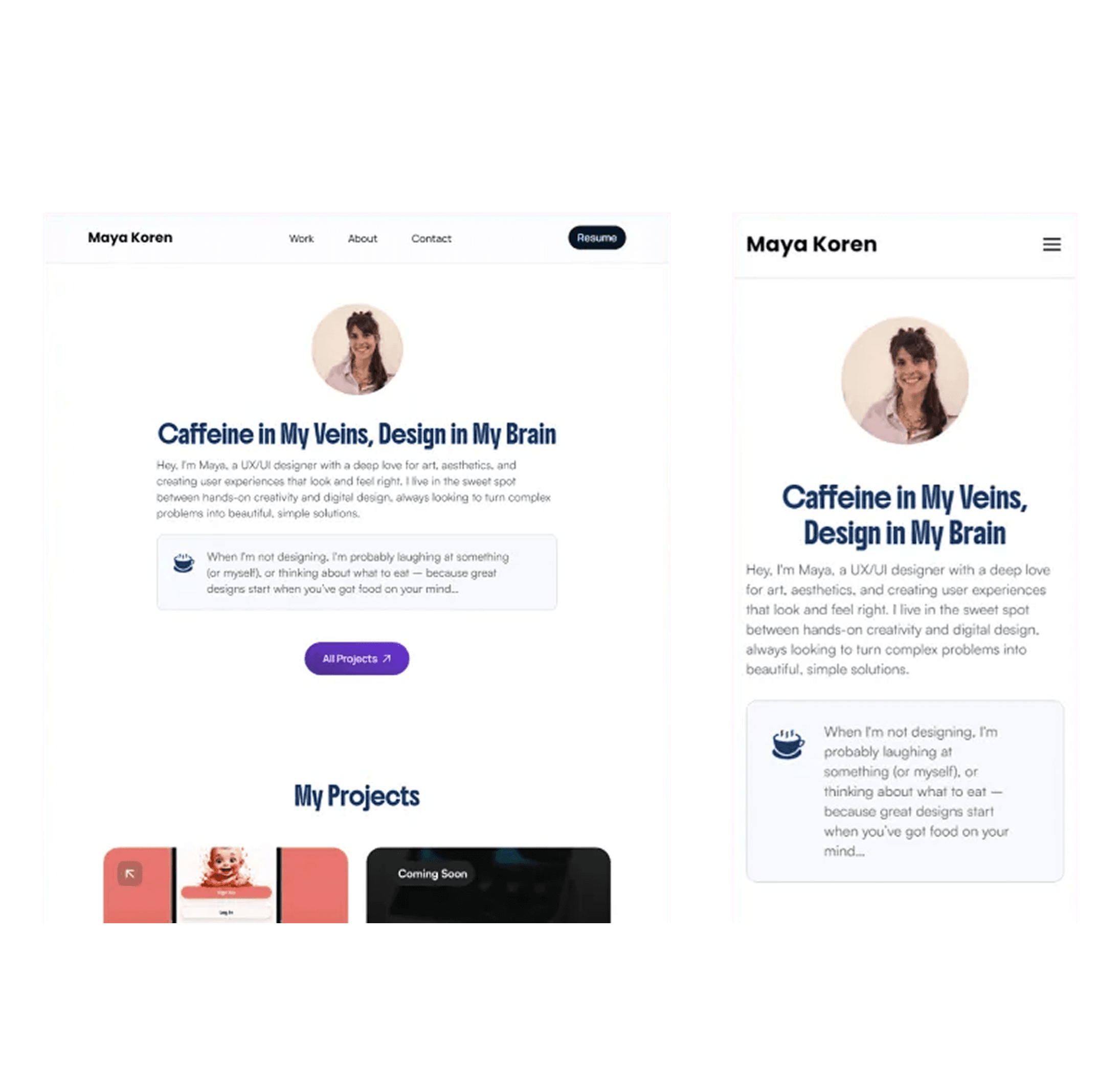 ליוויתי את סיגל במגוון פרויקטים בלימודיה, מסיוע בעיצוב אתרי אינטרנט ואפליקציות מובייל ועד לייעוץ בפיגמה ובתחום חוויית המשתמש. העבודה המשותפת אפשרה לה להעמיק את היכולות שלה ולהציג תוצרים מקצועיים ומרשימים כמעצבת.